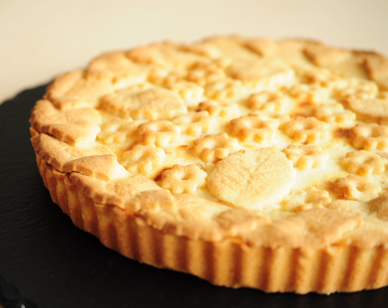 Песочное тесто равномерно распределить по форме кольца диаметром 18см и высотой 2,5см. Далее на песочное тесто выложить сырную начинку, разровнять. Затем отсадить из кондитерского мешка брусничную начинку п/ф, разровнять. Выровнять поверхность, посыпать штрейзельной крошкой п/ф. Поставить выпекать при температуре 180°С в течении 45 минут. Далее пирог достать из печи и оставить для стабилизации на 4-6 часов. Остывший пирог отдекорировать с помощью не тающей сахарной пудры.
