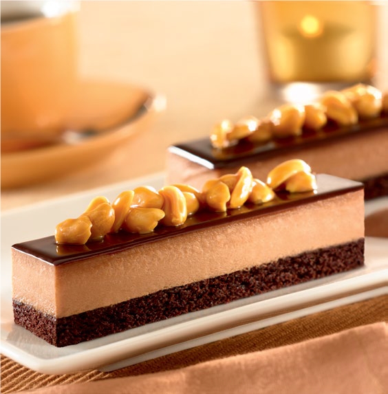 В форму необходимого размера вложить выпеченный п/ф. Сверху в край формы заполнить кофейным суфле. Дать застыть в условиях помещения. Поверхность пирожного декорировать холодным гелем Брило шоколадная. Порезать на порции необходимого размера. Соленый арахис перемешать с Дели Ирис и выложить на пирожное.