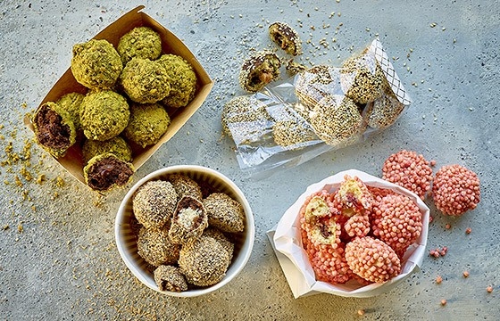 раскатать массу картошку , вложить в середину начинку, скатать в шарик. Покрыть полностью ганашом, обвалять в орехах.