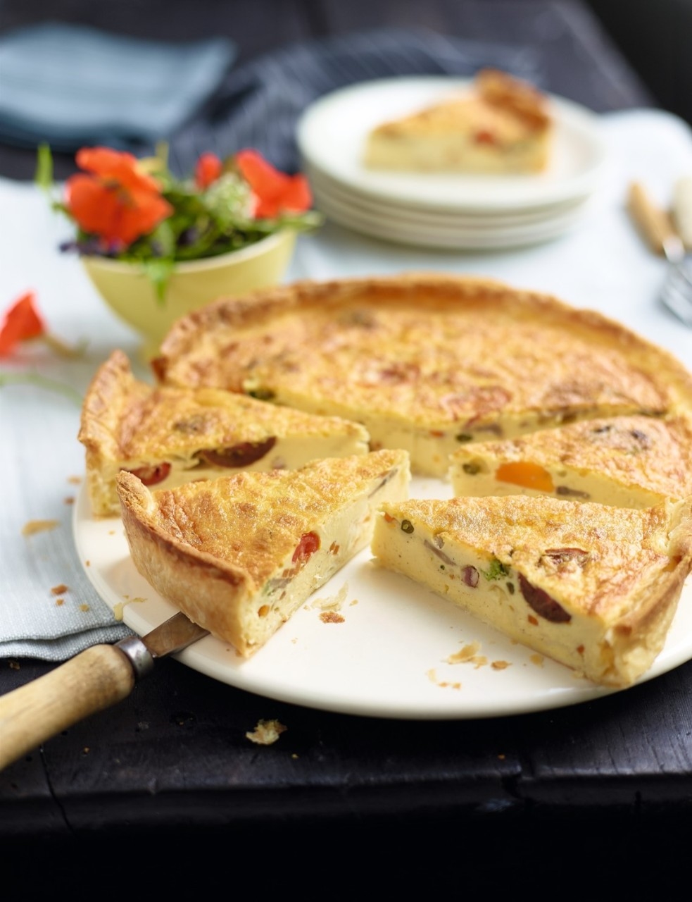 В сырой песочный полуфабрикат выложить начинку с ветчиной и сыра. Все залить заливкой на Кьюзипаком Шеф. Поставить выпекать при t 160-170°С в течении 25-30 минут.